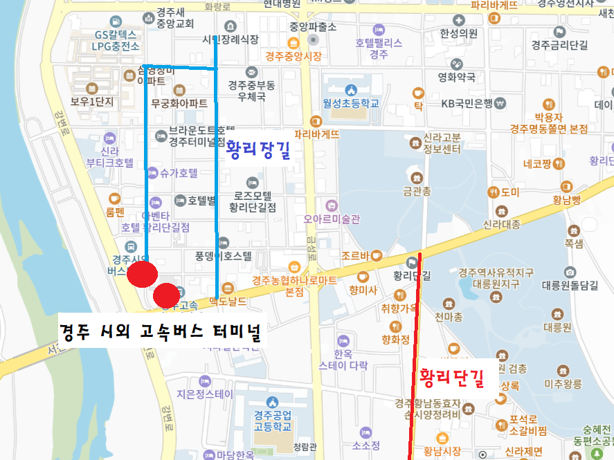 요즈음은 시내 관광이 대세이다. 경주에는 ‘황리단길’이 있다. 경주 대표적인 관광 거리이다. 반면 여기 이 지역은 버스터미널에 가까워 관광객들이 머무는 지역이다. 이 지역에 많은 숙박시설과 음식점이 모여 있다. 이렇게 된 지가 벌써 반백년이 넘었다. 여기서 황리단길은 걸어서 10분 거리다. 그래서 관광객들은 터미널에서 내려 여기서 묵으면서 걸어서 황리단길로 이동하여 관광한다.