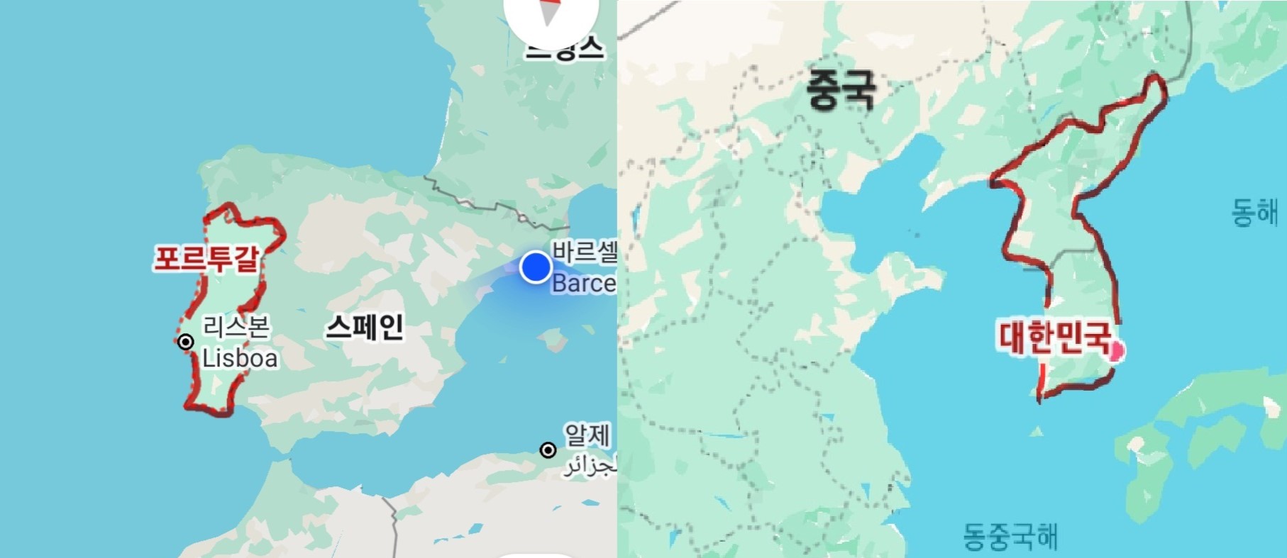 반면, 한국 인구 5000만 명, 한반도 면적은 약 23만 Km2(남한 10만 Km2, 남한 면적은 포르투갈 면적과 비슷하다), 북쪽으로 중국이 가로 막고 있다. 즉 한국은 중국을 지나야 아시아 대륙에 이를 수 있다. 오로지 동쪽과 남쪽 태평양 바다로만 자유로이 진출할 수 있다. 이는 포르투갈과 매우 비슷한 지리적 환경이다.